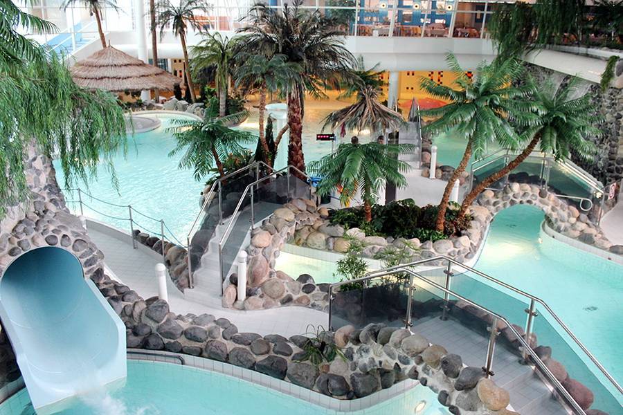 | Стоимость входа | Билет “Тропический лес и бассейны”: для взрослых – €42, для детей – €33, детям до 5 лет вход свободный. Билет “Комбо”: для взрослых – €49 (бесплатный вход в фитнес-зону), для детей – €39,50, детям до 5 лет вход свободный. |