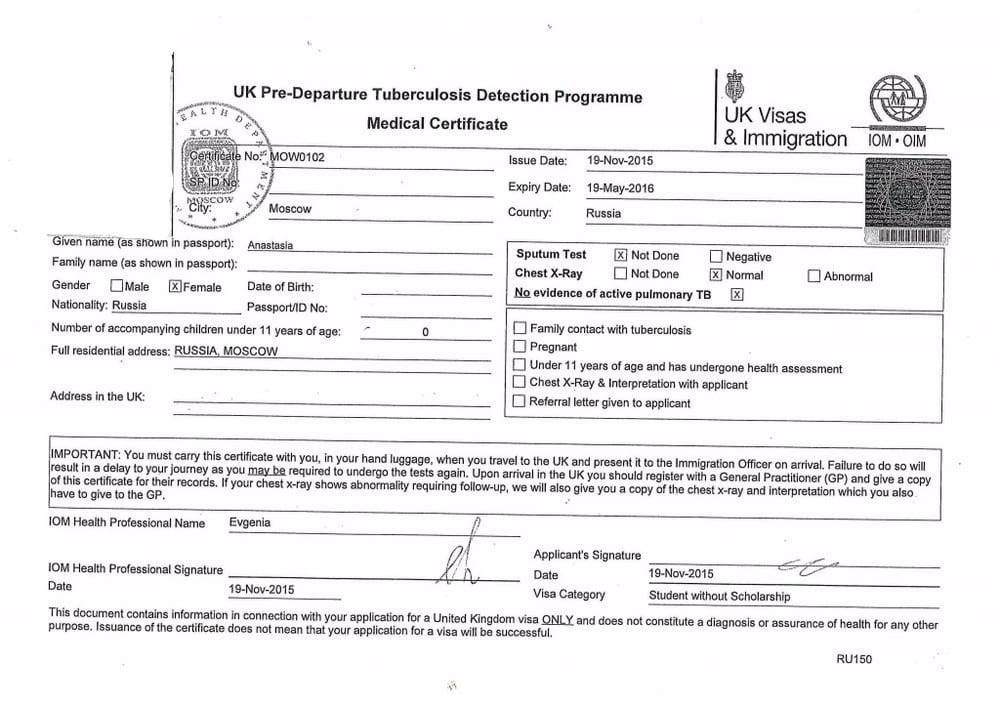 - Медицинская справка, подтверждающая отсутствие туберкулеза. Должна быть оформлена в клинике, которая получила аккредитацию МВД Великобритании. Справка оформляется для любого визита, который длится дольше полугода.
