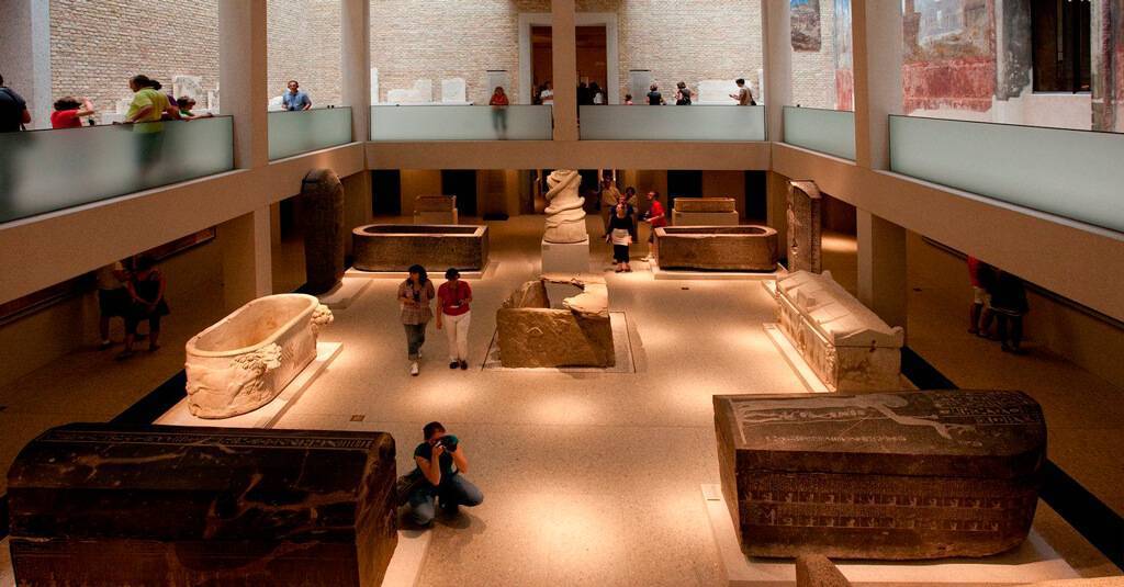 Пространство круглого купольного зала-ротонды отведено греческим каменным и мраморным скульптурам, расположенным на постаментах между стройных дорических колонн в порядке хронологии. Второй этаж отдан искусству Древнего Рима и этрусков. Он знакомит с портретами Клеопатры и Цезаря, скульптурой императора Клавдия, саркофагами, фресками, мозаикой «Битва кентавров», мраморными барельефами, изображающими шествия богов. Здесь увидите несколько Фаюмских портретов, традиционно создававшихся для гробницы на тончайших золотых листах еще при жизни человека. Видное место занимают эротические скульптурные композиции из камня и бронзы, вазы и медальоны с эротическими сюжетами.