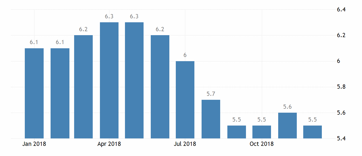 В 2017 году уровень безработицы был 6,7 в 2018 году он снизился до 5,5 процента.