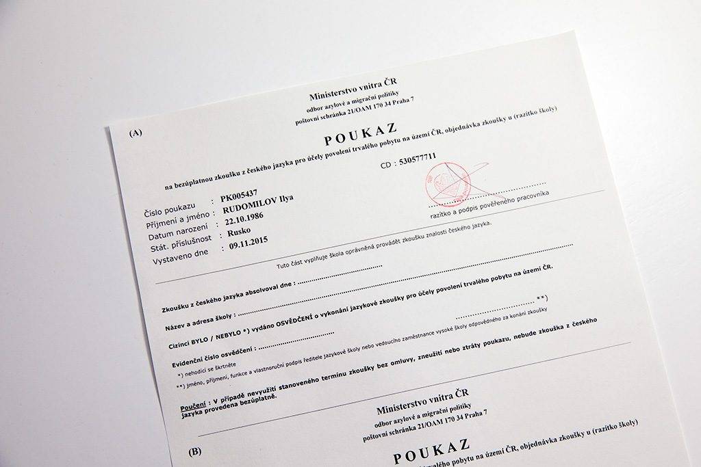 - Сертификат о сдаче экзамена по чешскому языку (A1), обществознанию и истории Чехии;
