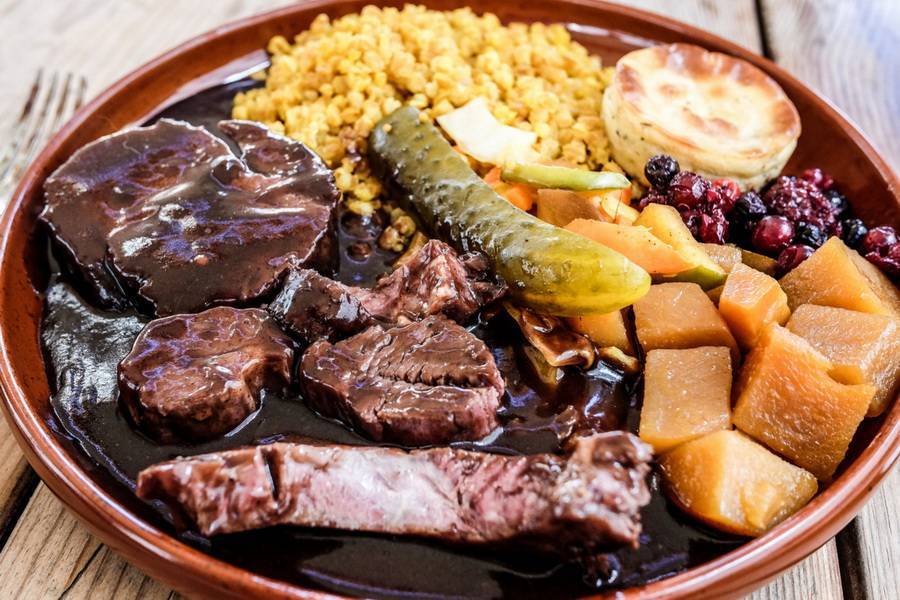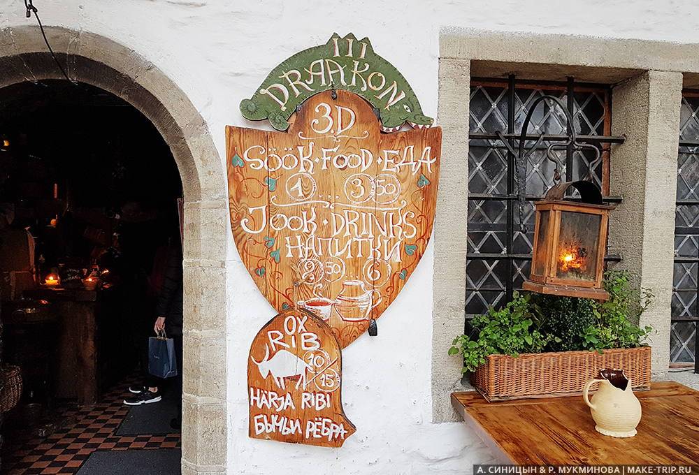 В Таллине мы ели в популярной таверне III Draakon в здании Ратуши. Известна она благодаря средневековому антуражу, низкими ценами и колоритной хозяйке. Вся еда — всего 1-3 евро! Потрясающий суп из мяса лося стоит 2 евро, пирожки по 1,5 евро. Напитки дороже — 2-3,5 евро. Порции небольшие, но еда очень вкусная.