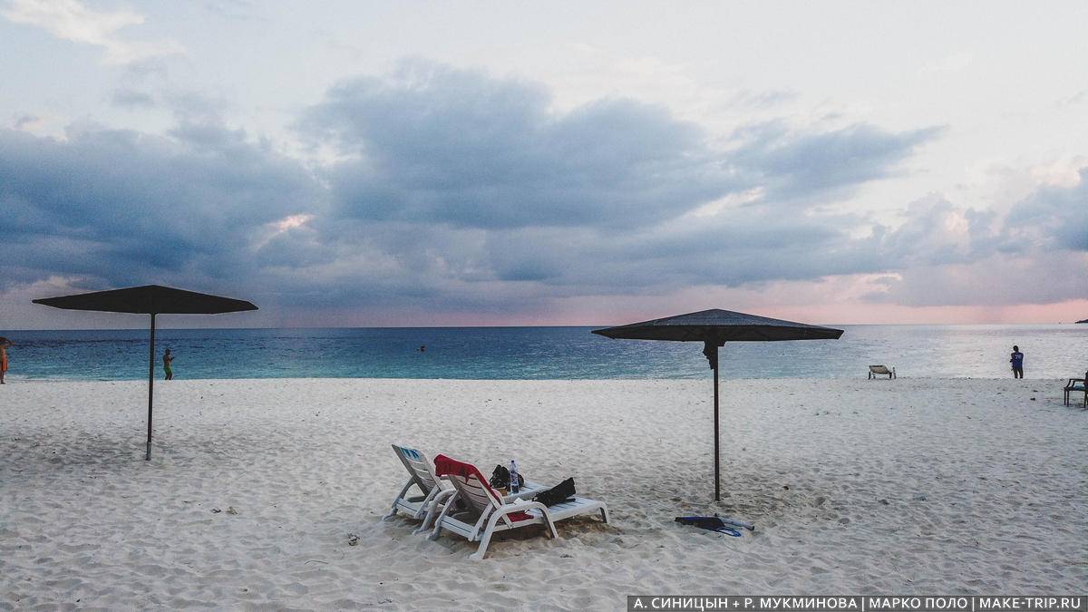 Пляж на острове Укулас. На всех туристических пляжах локальных островов есть лежаки. У каждого отеля свои, но лежаков так много, что можно выбрать любой — никто не прогонит.