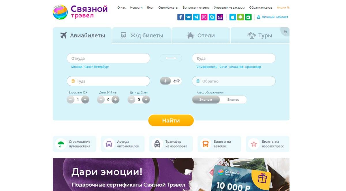 Купить ж/д или авиабилет, взять напрокат автомобиль, заказать трансфер, забронировать отель – это все возможно на сайте Связной Трэвел. С февраля 2012 года компания помогает путешественникам в планировании отдыха и деловых поездок. Простой поиск не займет много времени на заполнение формы и покажет оптимальные варианты по выбранным рейса.