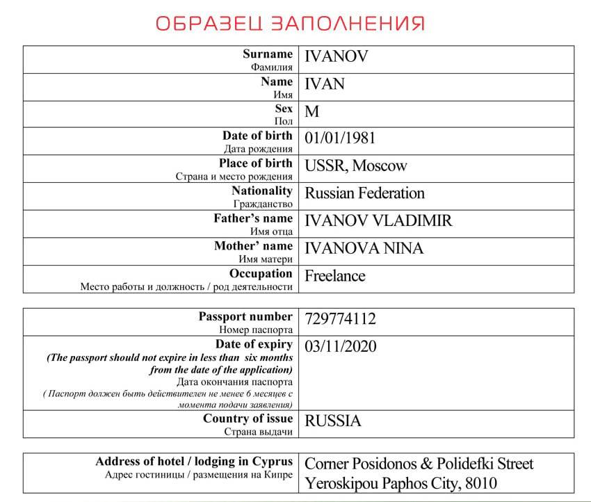 - Адрес проживания имеется в виду на Кипре, поэтому необходимо его знать, даже если это отель;