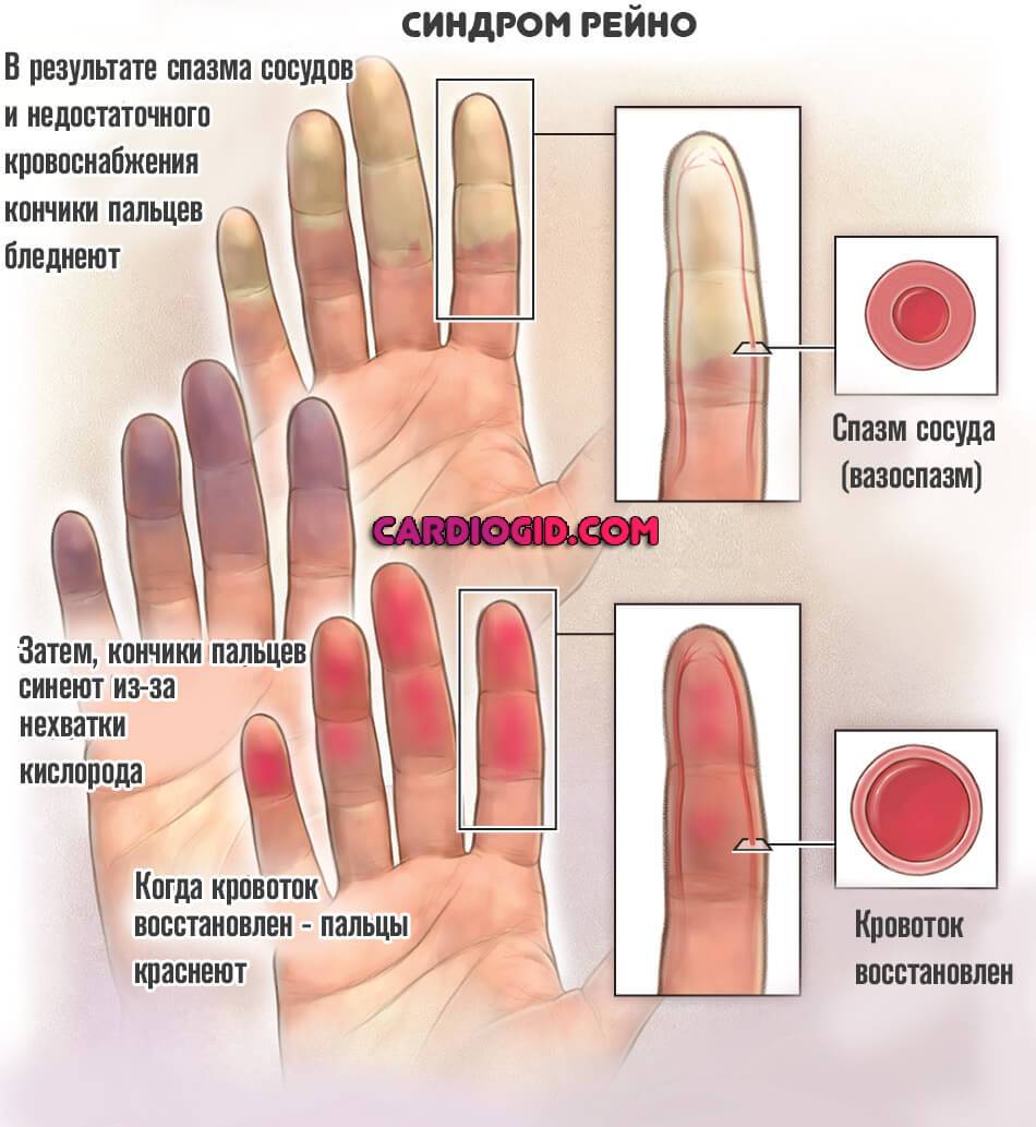Ещё одна форма нарушения кровообращения — Синдром Рейно. Симптом патологии: конечности, при перемещении из холода в тепло, сначала белые и онемевшие, затем синеют и отекают.