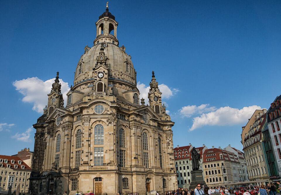 Блистательный элегантный купол одного из известнейших храмов Германии видно издалека. Фрауэнкирхе — это главный символ «Флоренции на Эльбе», появившийся в центре города в 1743 году, уничтоженный бомбардировками союзников в феврале 1945-го и вновь открытый в начале XXI столетия.
