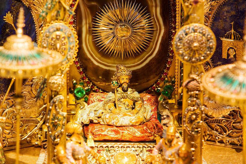 Флагман коллекции — крупнейший в мире грушевидный алмаз, купленный Августом III в 1742 году. Стоимость драгоценности составляла 400 тыс. талеров, что превышало бюджет строительства Дрезденского кафедрального собора. Вес восхитительного камня, ослепляющего игрой света и необыкновенным яблочно-зеленым оттенком, — 8,2 г. Кроме бесценного бриллианта, в залах музея вы найдете уникальные реликвии: