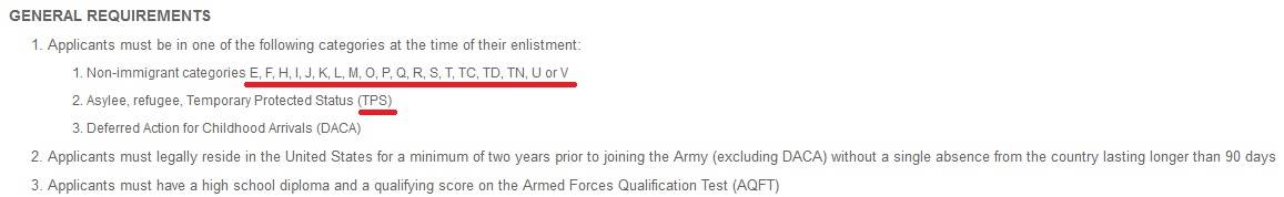 Программа, позволяющая набирать на службу не граждан США с востребованными навыками. Лица, которые присоединяются к армии с помощью этой программы, могут перейти от неиммиграционной визы и иммигрантов / беженцев / статусом временной защиты (TPS) непосредственно на гражданство.