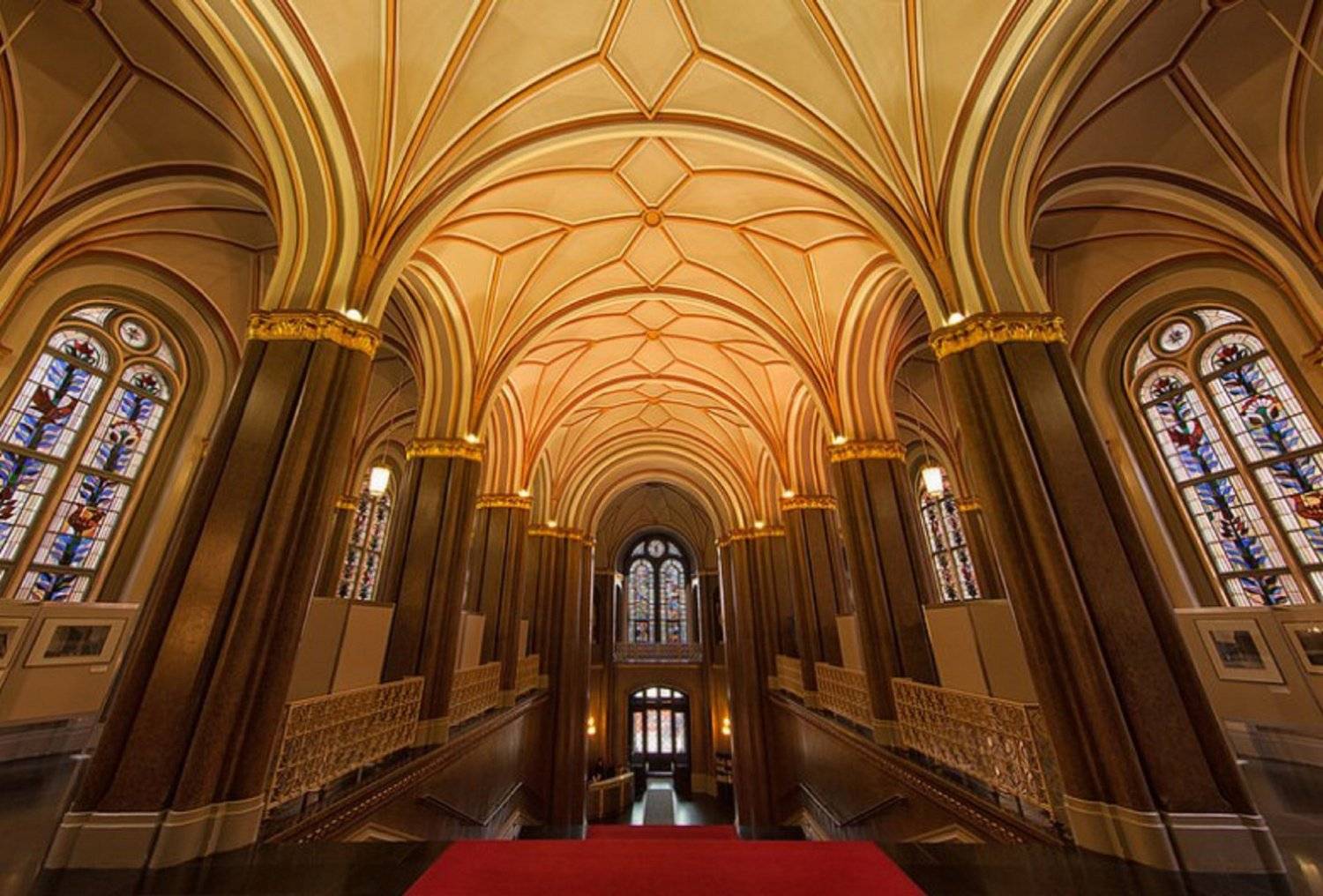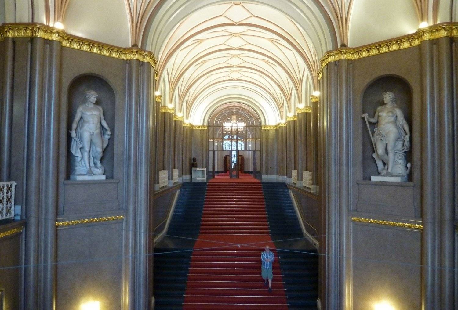 Ступени лестницы Красной Ратуши, как и положено для зданий такого уровня, покрыты дорогими ковровыми дорожками красного цвета. Внутри этого здания находится много белоснежных колонн с золотой отделкой, от великолепия которых, в прямом смысле, захватывает дух. Практически все стены Ратуши выполнены в пастельно-бежевых тонах, а потолок имеет оранжевый оттенок.