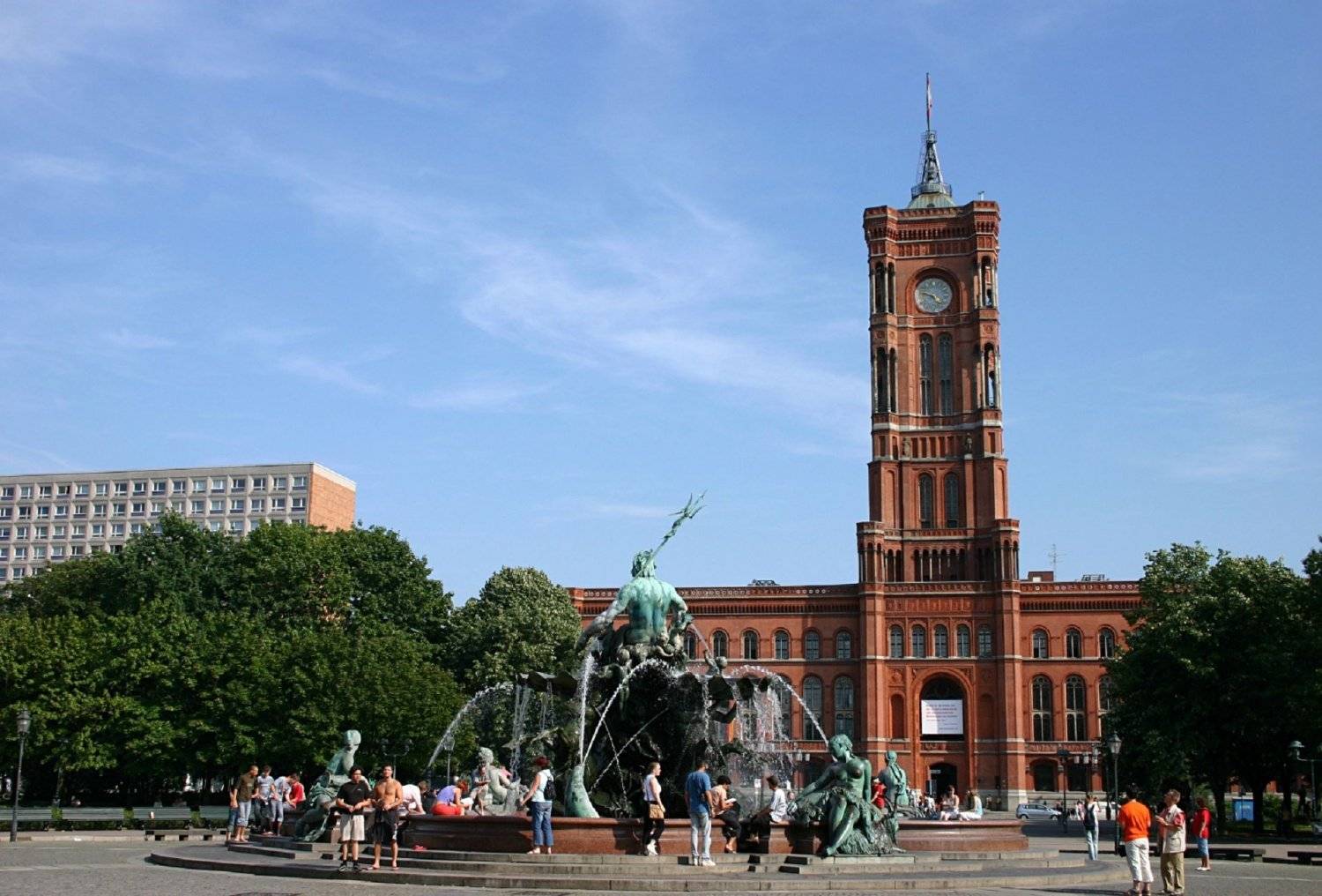 Говоря о Красной ратуше в Берлине нельзя не упомянуть и о прилегающей к ней площади: для ее строительства рабочим потребовалось снести практически целый квартал средневековых зданий. Сегодня вокруг площади разбит живописный парк, его центр украшает оригинальный фонтан «Нептун». Скульптура была создана еще в 1891-м году мастером Бегасом, и вплоть до конца Второй Мировой войны находилась в Берлинском замке. Однако после того как замок был разрушен во время бомбардировки, администрацией города было принято решение перенести скульптурную композицию на площадь перед Красной Ратушей.