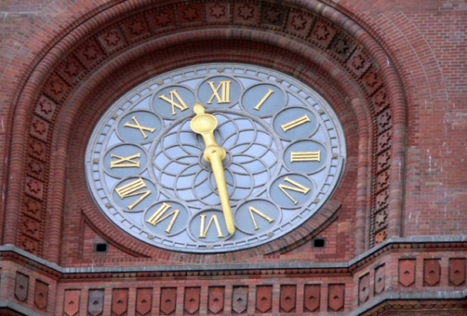 В верхней части Красной ратуши находятся главные часы Берлина. Точное время они отбивают двумя колоколами. Большой колокол, отбивающий каждый час, настроен на ноту «ре», а малый колокол, настроенный на «соль», отбивает четверть часа. Вершину здания муниципалитета охраняют… восемь медведей. Не живых, конечно, а работы Вильгельма Вольфа. Каждый такой охранник, изваянный из песчаника, отличается трехметровым ростом. Их нахождение здесь отнюдь не случайность: символами германской княжеской династии рода Асканиев, представители которого с XI века постоянно проживали в Саксонии, являются именно медведи.