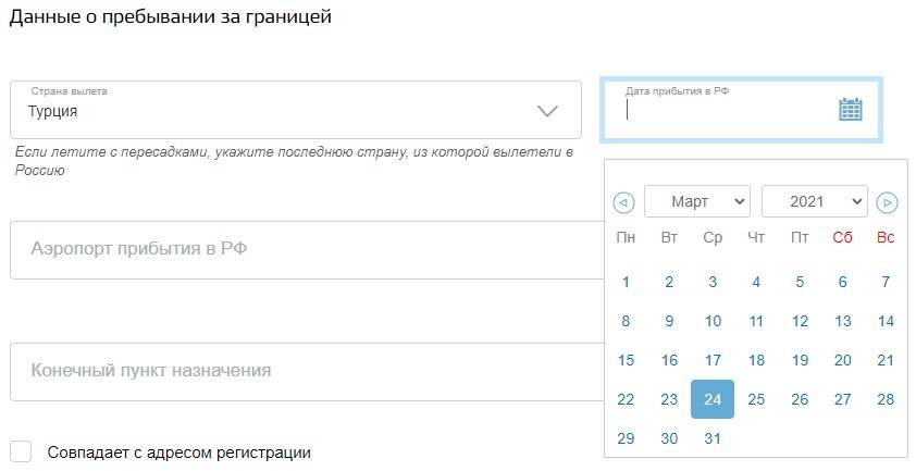 В анкете нужно указать паспортные данные (в вашем аккаунте они уже должны быть проставлены), а также сообщить информацию о пребывании за границей и о месте назначения в РФ.