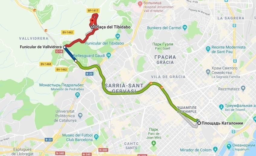 Альтернативный вариант – заплатить 4,4 EUR и сесть на фуникулёр Funicular del Tibidabo на Plaça del Doctor Andreu у подножия холма. На этой площади останавливается «синий» маршрут туристического автобуса Barselona Bus Turistic. До Plaça del Doctor Andreu можно добраться и иначе. Сначала на метро линии L7 доехать до конечной станции Avinguda Tibidabo. Затем выйти из метро на лифте (эскалатора нет) и, заплатив 5,5 EUR, сесть в голубой ретро-трамвай Tramvia Blau, функционирующий с 1911 г.