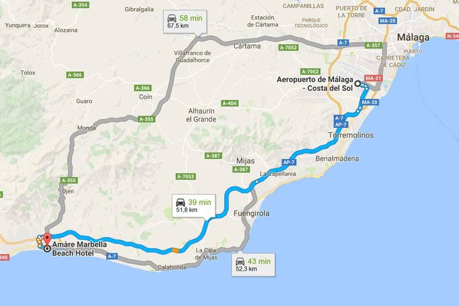 Ближайший к Марбелье аэропорт находится в Малаге. Добраться из Малаги в Марбелью можно на автомобиле либо на автобусе. Поезда в Марбелью не ходят. Расстояние от Малаги до Марбельи 58 километров.