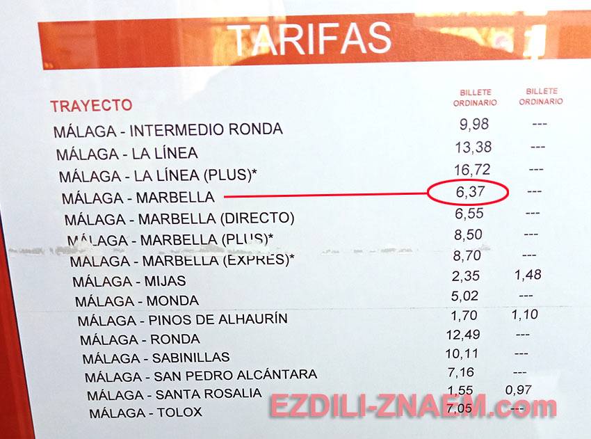 Имейте ввиду, что прямых автобусов с конечной остановкой в Марбелье мало. Обычно это проходящие автобусы, которые едут в Ронду или Севилью. Поэтому при покупке билета уточните в кассе номер платформы и направление (конечную остановку) автобуса.