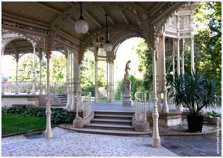 Центральную улицу города разделяет река Тепла. Мы заметили, что вода в ней парит и наверняка теплая, как и название. По обе стороны в пышном убранстве расположены гостиницы, пансионаты, лечебные учреждения, спа-центры. Архитектура зданий выполнена в стиле барокко и модерн. Выглядят они очень нарядно и ярко. Картинка потрясающая.