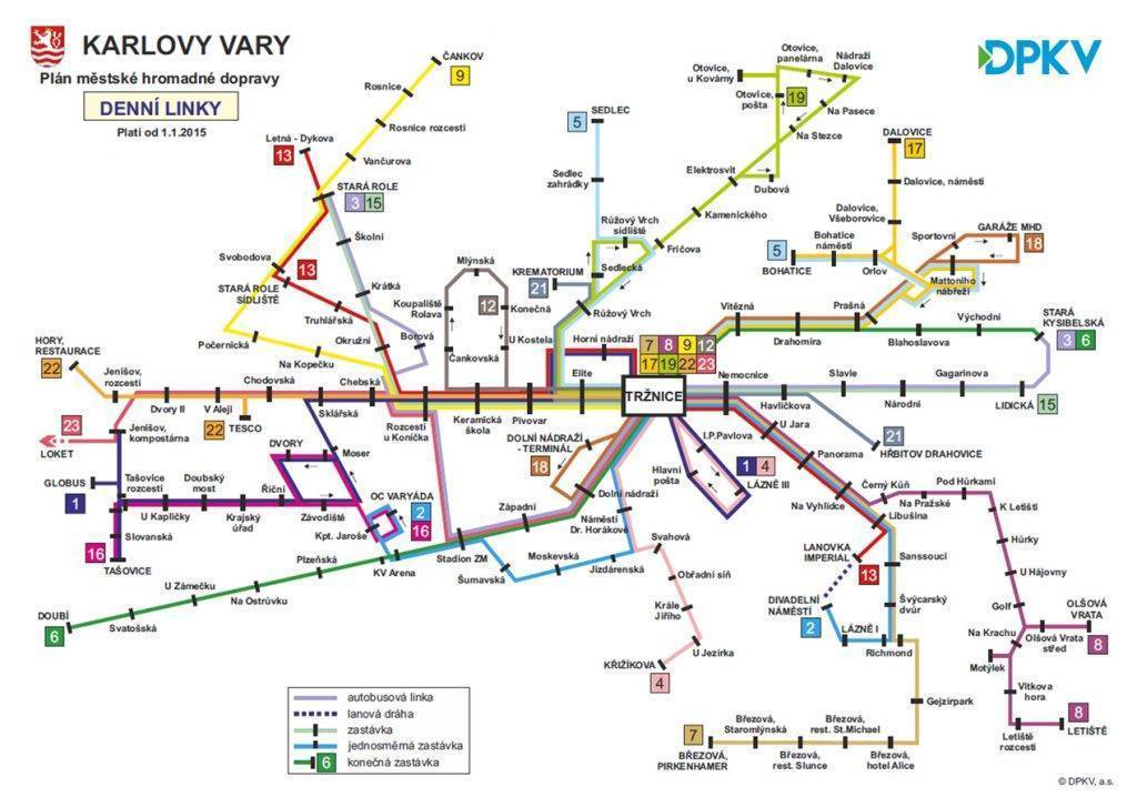 Карта городских линий в Карловых Варах, DPKV, a.s.