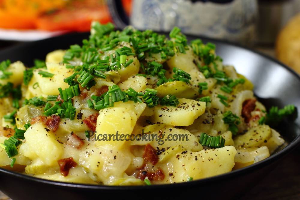 — это очень популярное блюдо, как в Германии, так и в Австрии. Блюдо распространенное, простонародное и очень вкусное. В нашей семье я не редко готовлю немецко-австрийский картофельный салат, поскольку мы его очень любим, а для моего мужа, это еще и вкус детства. Моя свекровь, наполовину немка, раньше часто готовила этот салат дома, так, как это делала ее мама немка. Баварская версия картофельного салата несколько отличается от немецко-австрийской версии. Делается этот салат на копченом беконе, шпеке, как его называют баварцы, а не на колбасках и в салат добавляются маринованные огурцы. И это один из лучших картофельных салатов который приходилось мне делать или пробовать. Я даже не думала, что маринованные огурцы так обогатят этот салат свежестью вкуса и разнообразят консистенцию своим хрустом.