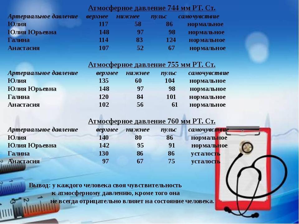 Атмосферное и артериальное давления взаимосвязаны. Понижение мбар ( пасмурная, дождливая погода) отражается на организме: