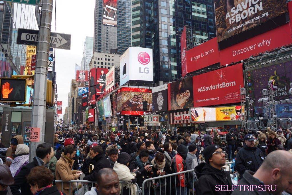 Мы тоже попытались это сделать. Вышли 31 декабря в 23-30 на Таймс-сквер. Подойти к площади мы смогли только потому, что наша гостиница была внутри оцепления. Оцеплений несколько. Через последнее нам не удалось пройти — все огорожено заборами и полиция не пускает. Хотя если бы и пускала все равно не удалось бы далеко уйти — народу как в переполненном автобусе. Погода очень холодная. Ветер, без шапки уши мерзнут. А местные девчонки в коротких юбках с пивом стояли несколько часов и ждали. Ужас! Не, надо ехать в более теплое время года.