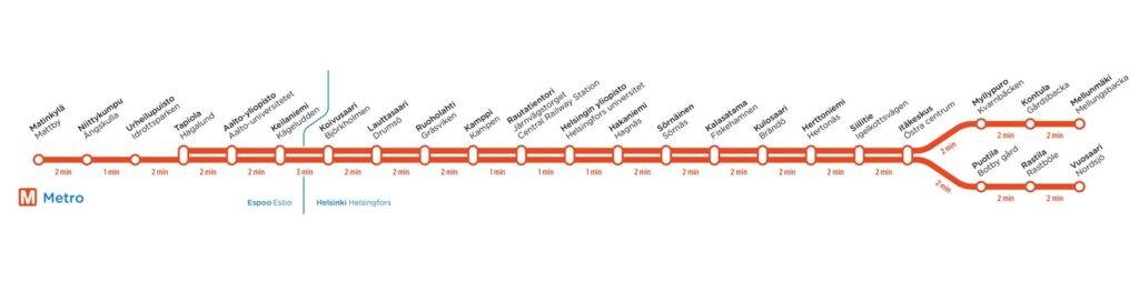 Метро города Хельсинки имеет одну, разделяющуюся на две ветки, линию. Метро соединяет центральную и восточную части города. Метро Хельсинки имеет три конечные станции, Ruoholahti на западе и Mellunmäki и Vuosaari на востоке. Поезда следуют поочерёдно по маршрутам Ruoholahti – Mellunmäki и Ruoholahti – Vuosaari. Длина линий метро Хельсинки составляет 21 километр, количество станций метро – 17. Больше всего пассажиров обслуживает станция Rautatientori (Вокзальная площадь). Станция расположена рядом с Центральным вокзалом и многими магазинами и торговыми центрами. Станция метро Kamppi также расположена в центре города. Станция соединена с торговым центром Kamppi и автобусным вокзалом Хельсинки. Рядом со станцией метро Itäkeskus расположен крупнейший в Хельсинки торговый центр Itis, рядом со станцией Vuosaari расположен торговый центр Columbus.