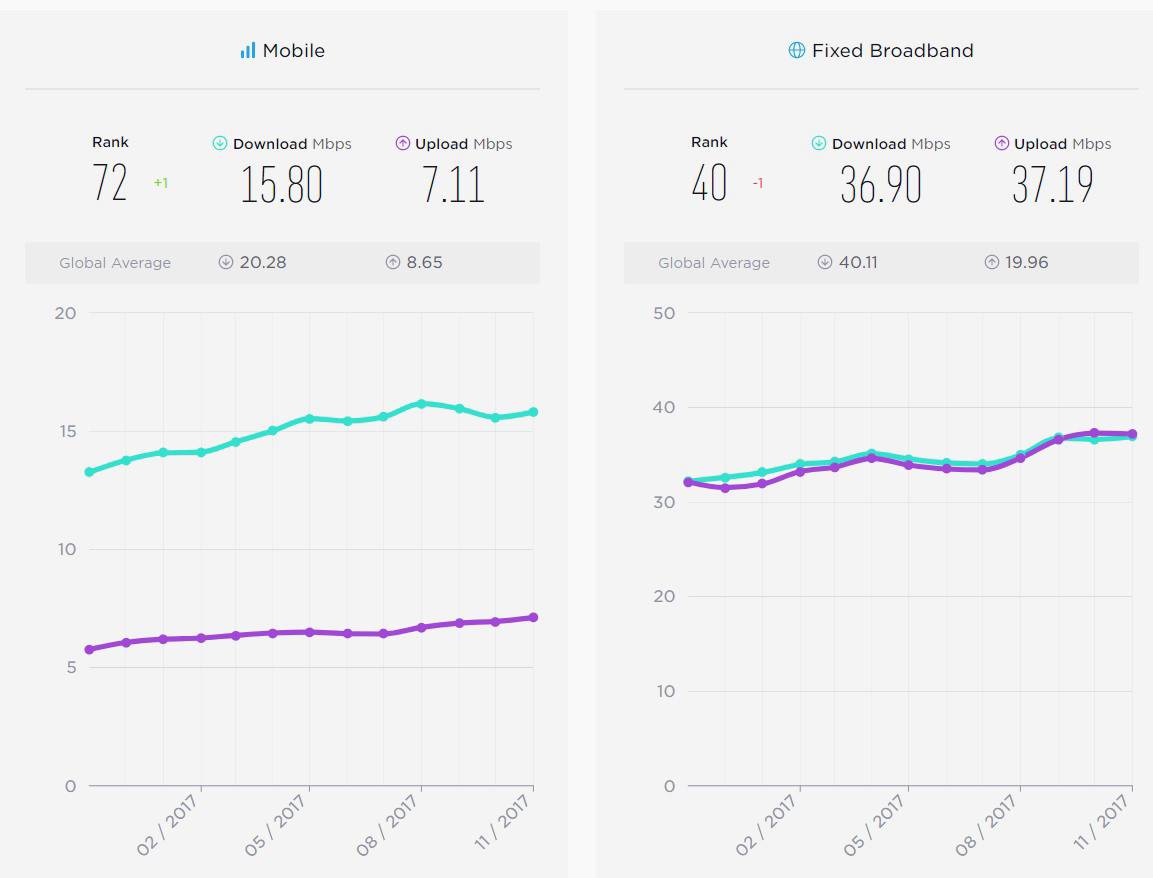 Россия, впрочем, на 72-м: с результатом 15,80 Мбит/с (скачивание) и 7,11 Мбит/с (загрузка) обошла Никарагуа, но уступила Гондурасу и Эквадору. Что ж, в прошлом году РФ была на 73-м месте.