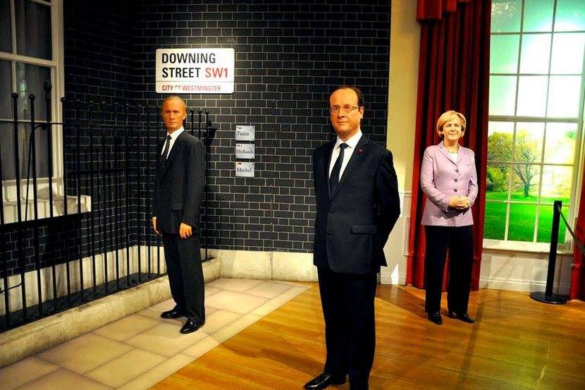 Скульптуры (слева направо) президента России (Владимир Владимирович Путин), президента Франции (Франсуа Олланд), федерального канцлера Германии (Ангела Меркель)