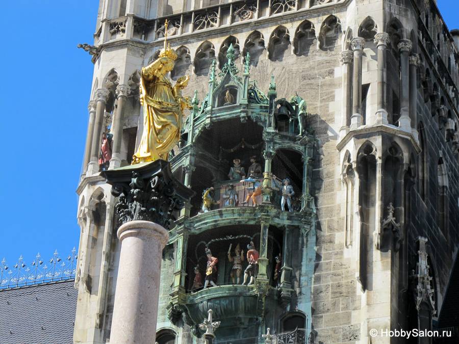 На башне Новой Ратуши находится одна из главных достопримечательностей баварской столицы – знаменитые часы с боем Глокеншпиль (Glockenspiel), созданные бельгийскими мастерами карильонного искусства в 1908 г.
