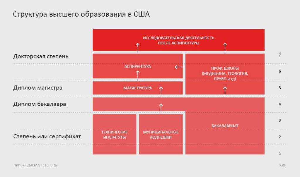 В Америке существует несколько ступеней высшего образования: комьюнити‑колледж (community college), бакалавриат, магистратура и аспирантура. Бакалавриат и комьюнити‑колледж — варианты для выпускников школ, остальные ступени подходят для тех иностранцев, кто уже окончил вуз на своей родине.