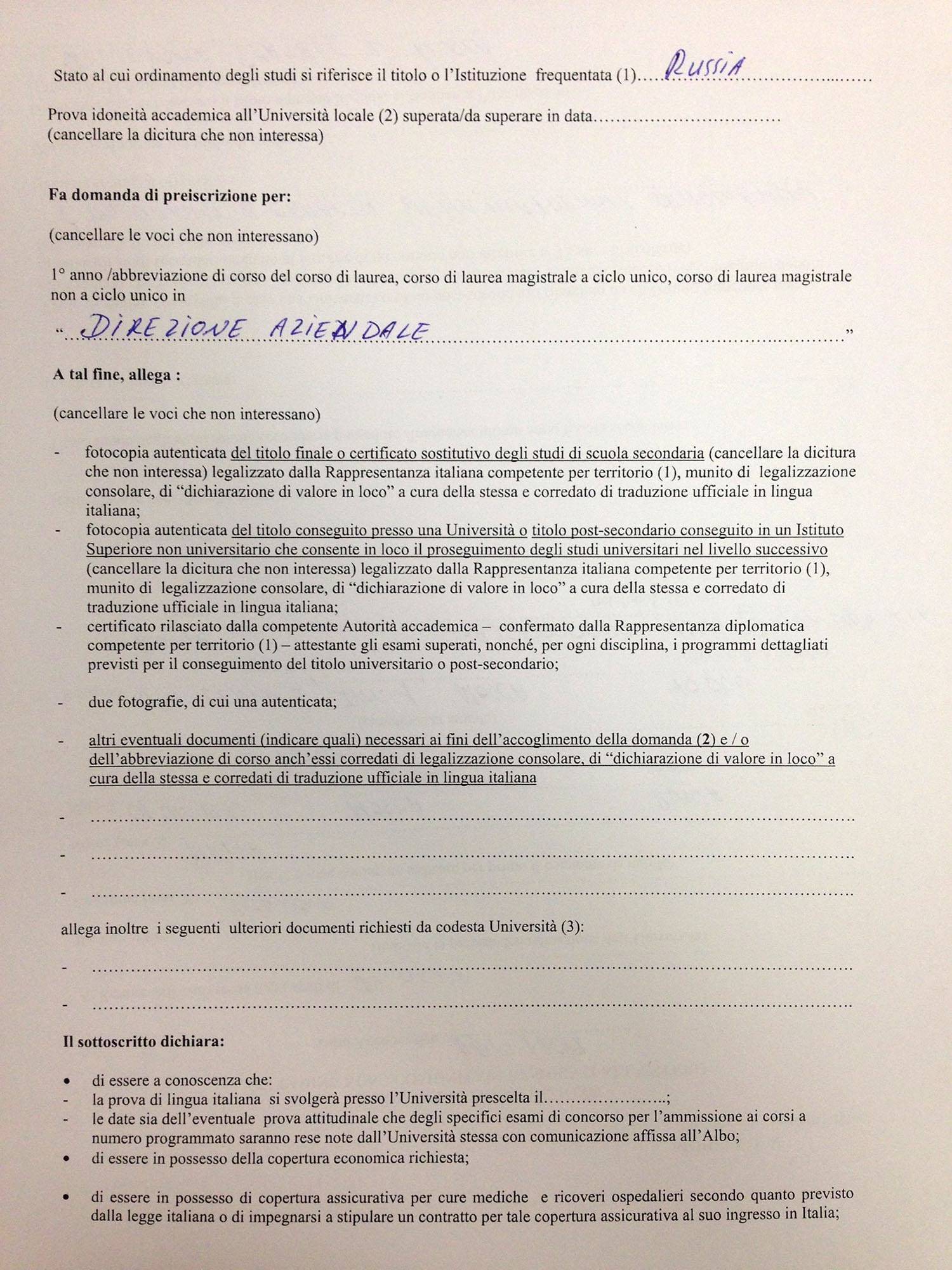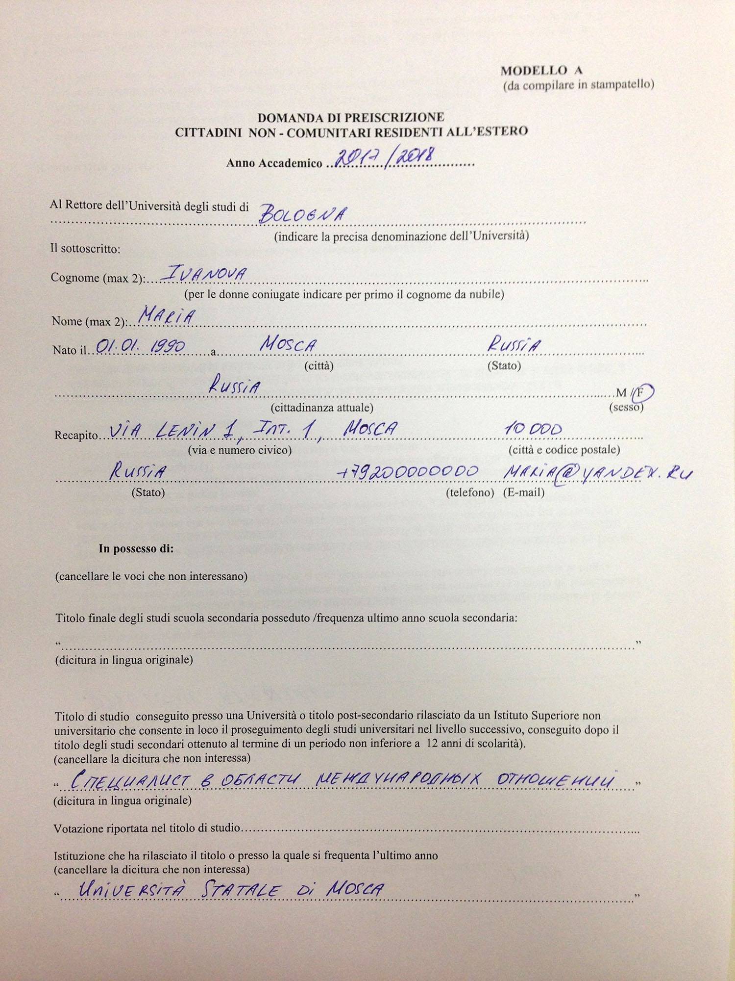 Предоставляется бланк запроса, который оформляется в соответствии с требованиями Итальянской Республики. Документ имеет форму modello A;