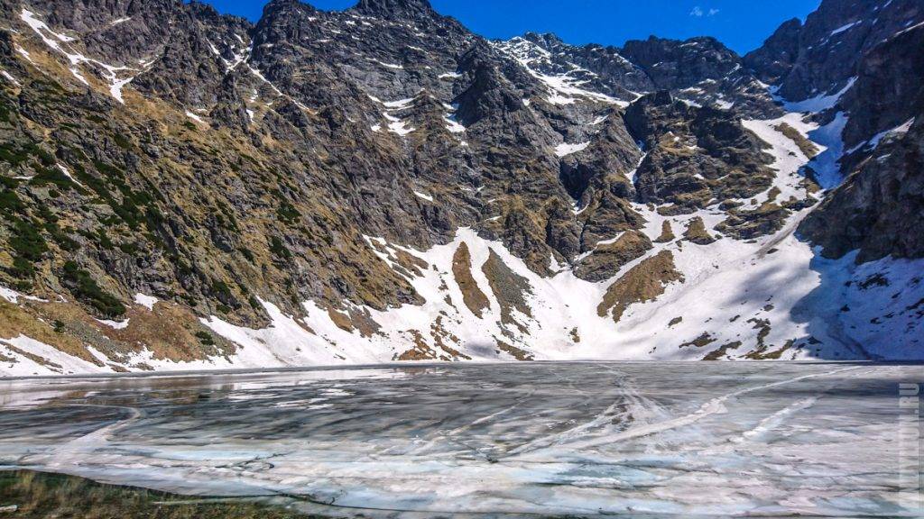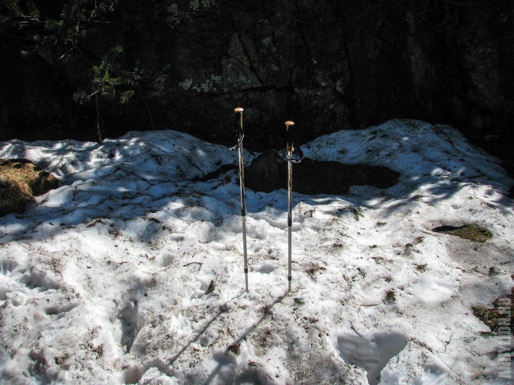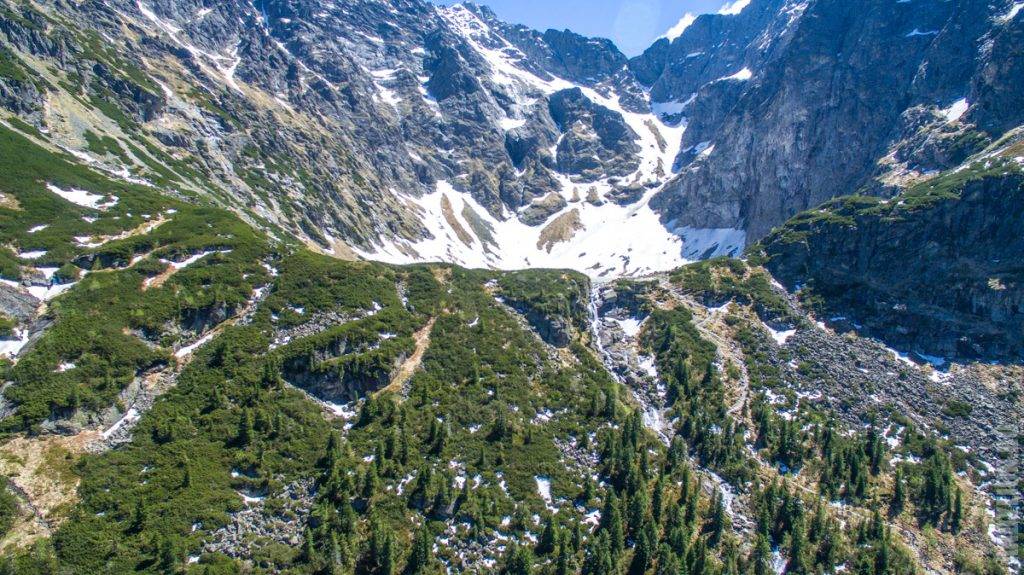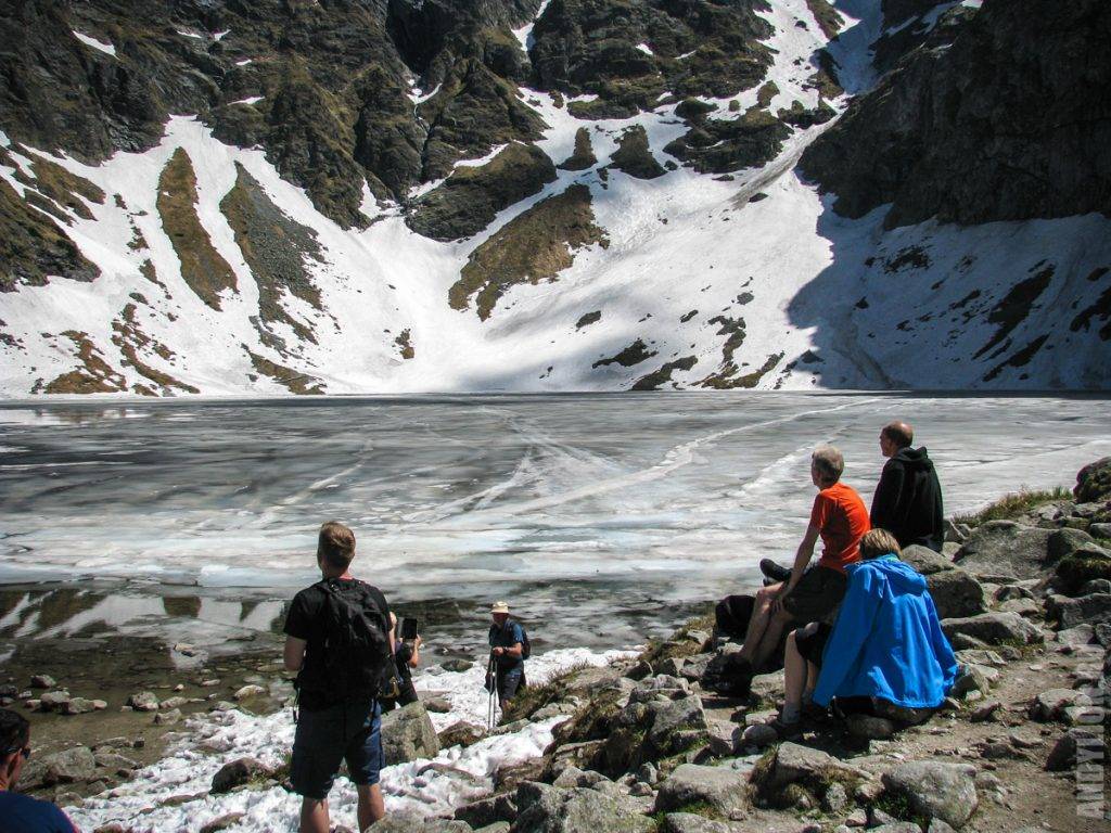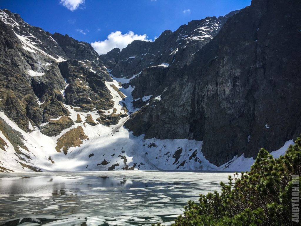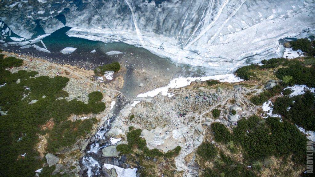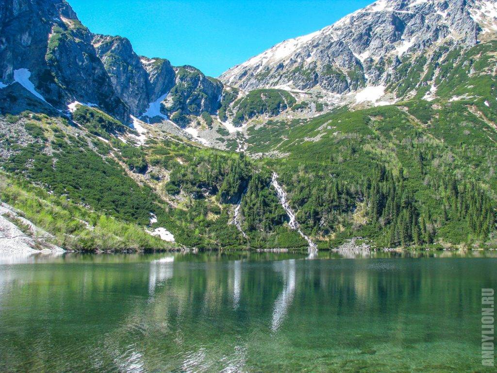 А на склонах еще полно снега. Где-то здесь продолжается путь для тех, кто покоряет главную вершину — пик Rysy, высота которого 2499 метров. Мы видели спускавшихся по склону людей. Делали они этом посредством горных лыж. На видео есть кадры этих экстремальных спусков.