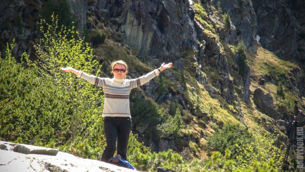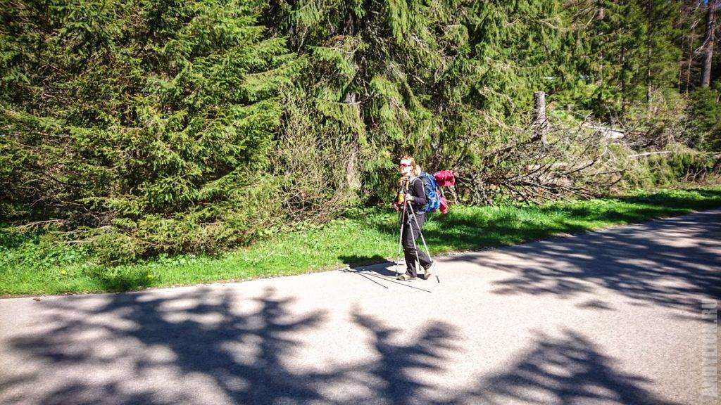 Переобулись, снарядились и вот Аня уже «бьет копытом», готова отправляться в путь. А путь нам предстоит немалый — почти 8 км от Паленицы до озера. Паркинг расположен на высоте 990 метров над уровнем моря. Нам нужно подняться на 400 метров выше.