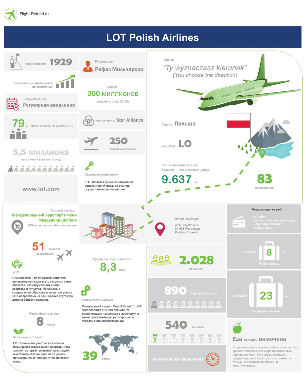 LOT имеет базовый аэропорт в Варшаве – имени Фредерика Шопена. Штаб-квартира тоже находится в столице Польши, Варшаве. Воздушный флот достаточно молодой и имеет среднее количество самолетов. Всего имеется более 40 самолетов. Большинство – всемирно известные Boeing и бразильский Embrair. Самолеты современные и очень комфортабельные. Трансатлантические перелеты совершает самая новая модель Боингов – 787.