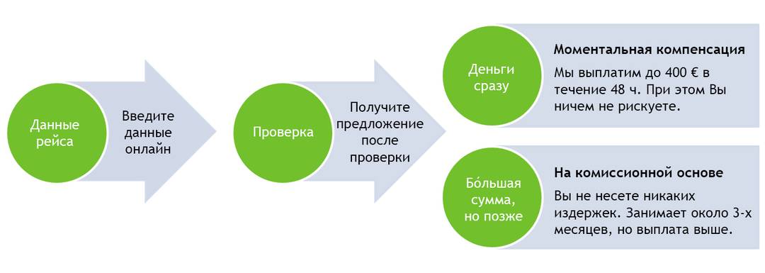- Выплата сразу – мы выкупим Ваше требование, Вы сразу получите деньги, и для Вас дело в шляпе. Даже если потом мы потерпим неудачу при взыскании долгов требования с авиакомпании, Вы все равно получаете выплату. Это самый быстрый вариант и с наименьшим риском для Вас.