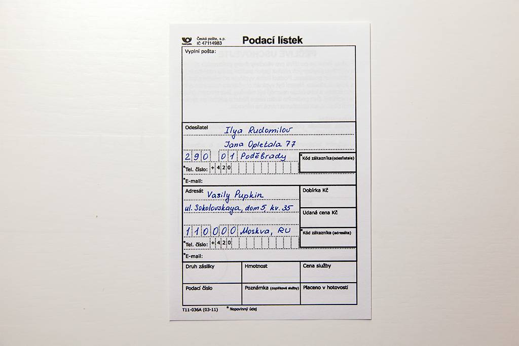Точь-в-точь по аналогии с обычным письмом покупаете конверт, подписываете его, берете точно так же номерок на почте. Но, во-первых, в окно вместе с письмом вам нужно подать заполненное подтверждение о подаче письма (чеш. Podací lístek