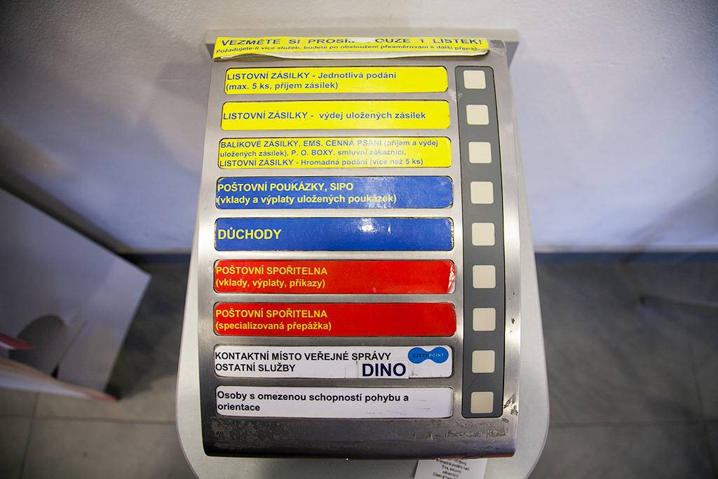 Многие отделения перешли на очереди по номеркам, в Подебрадах тоже принята эта система, посему на входе жмем на „Listovní zásilky — výdej uložených zásilek“: