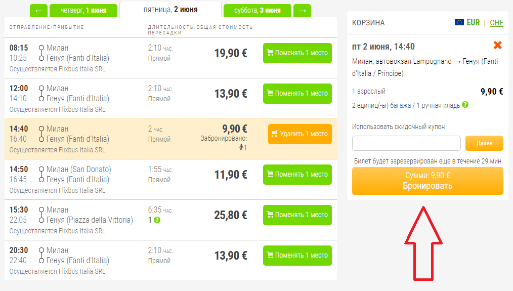 Маршрут автобуса проходит через следующие города: Milano – Como – Lugano (остановка) – Bellinzona (остановка) – San Bernardino – Chur (остановка) – Trubbach – Dornbirn (остановка) – Bregenz (остановка) – Lindau (остановка) – Munich.
