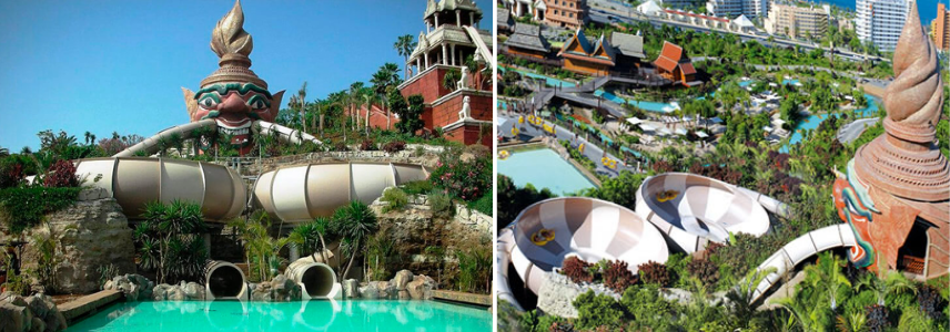 Тайская тематика присутствует повсюду в этом «водном королевстве»: остроконечные крыши, драконы, пальмы, экзотические божества, вылепленные из цемента, будто наблюдают за купающимися туристами. Не подумайте, что это банальная «завлекалка» для туристов. Позволение на использование стилистики древнего Сиама владельцы получили у самого короля Таиланда, а его дочь присутствовала на открытии. Автор, специально приглашенный архитектор из Бангкока, стремился отразить колорит восточной страны и создал самый большой комплекс строений в тайском стиле за пределами Таиланда.