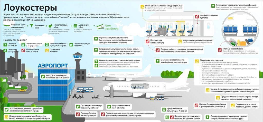 Основной принцип лоукостеров – это отказ от стандартных сервисных услуг, поэтому это самый бюджетный вариант. Пассажиры могут рассчитывать только на перелет из одного аэропорта в другой, а за дополнительные услуги, к примеру, перевозка багажа, напитки и питание установлена отдельная стоимость. Перевозчики максимально сокращают все расходы, поэтому предлагают самые дешевые билеты.