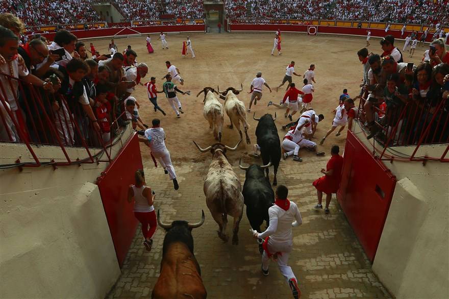Гонка начинается каждое утро ровно в 8 утра. Смельчаки бегут перед быками, стараясь не попасть под копыта, уворачиваясь от удара острых рогов животных. Действие происходит на булыжной мостовой, а также на узких улочках в Старом центре городка Памплоны на севере страны.