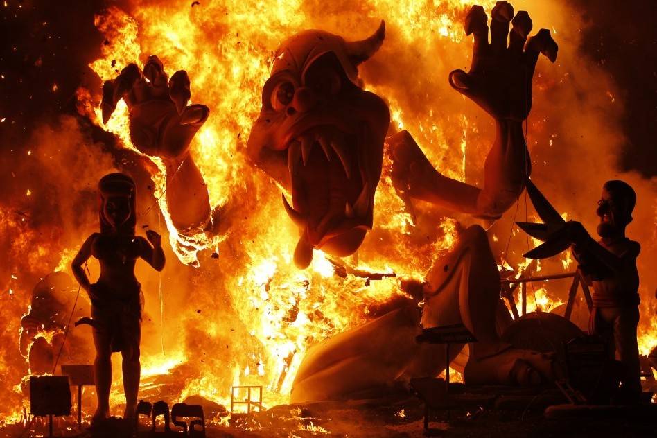 Главное событие праздника – сжигание огромных кукол «fallas», среди которых фигурируют реальные и сказочные персонажи в аллегорической форме.
