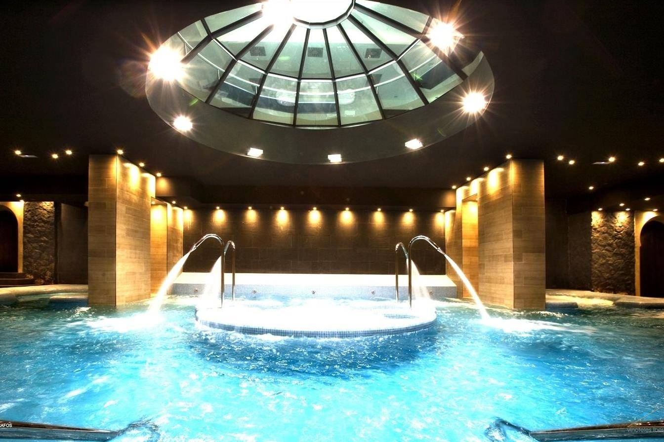 Бассейн – его вы видите на фото выше – занимает большую зону, имеет несколько джакузи и лежаков со включающимися пузырями и струями. Есть пара отдельно стоящих ванн с более прохладной водой, есть отдельная зона для самых маленьких, есть стремительная “река” с течением, проходящая по улице, под открытым небом (сам бассейн находится под крышей), с красивым видом на гору.