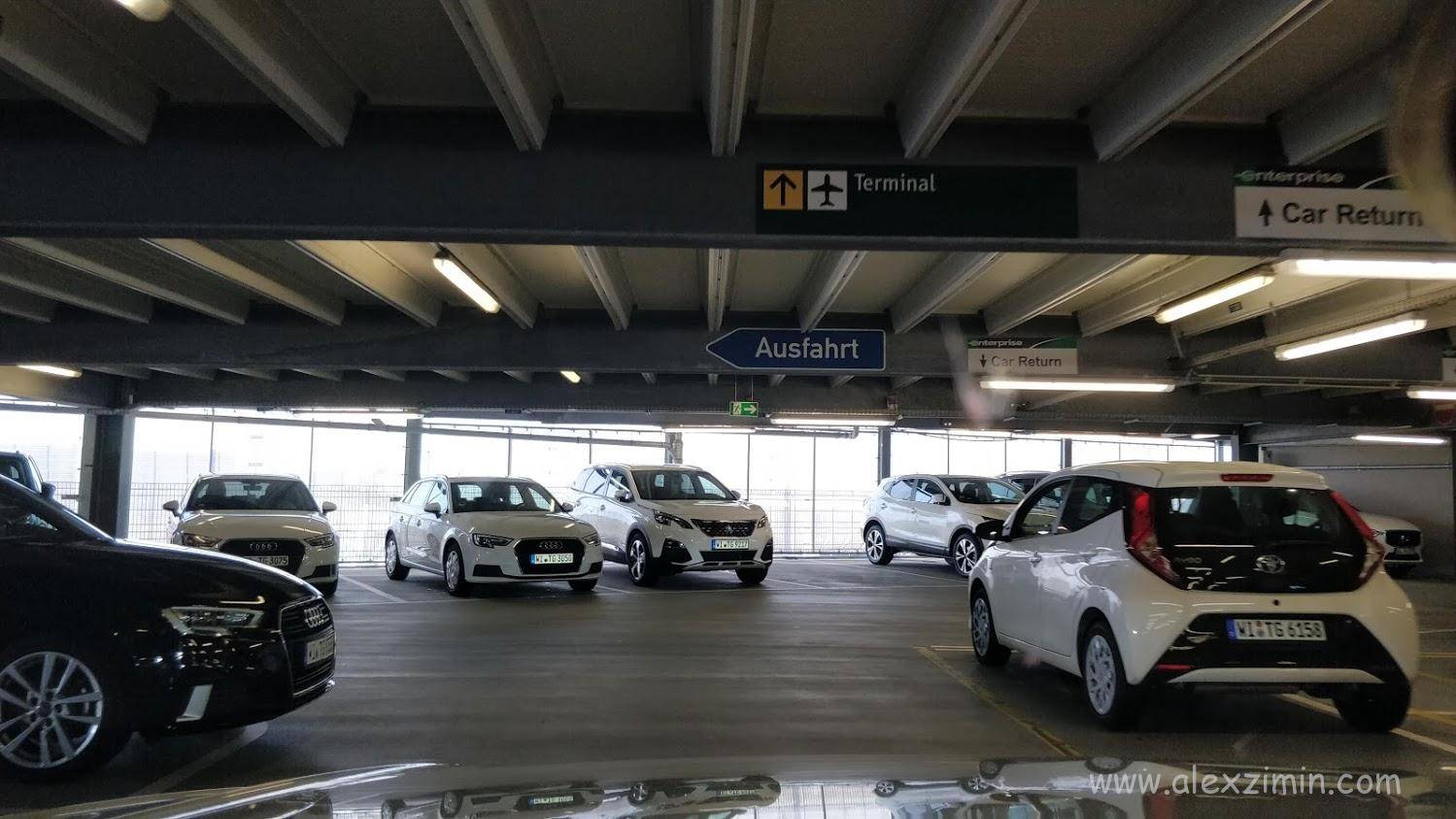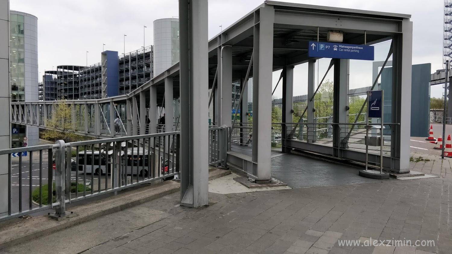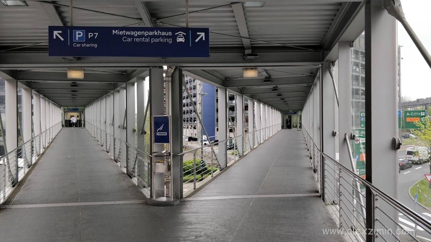 После оформления всех бумаг, нам рассказали как найти паркинг прокатных машин. Нужно было подняться на этаж выше (зал вылета из аэропорта), и выйти на улицу. Все прокатные автомобили расположены не в здании аэропорта Дюссельдорфа, а в отдельном здании, слева от аэропорта (Car Rental Center):