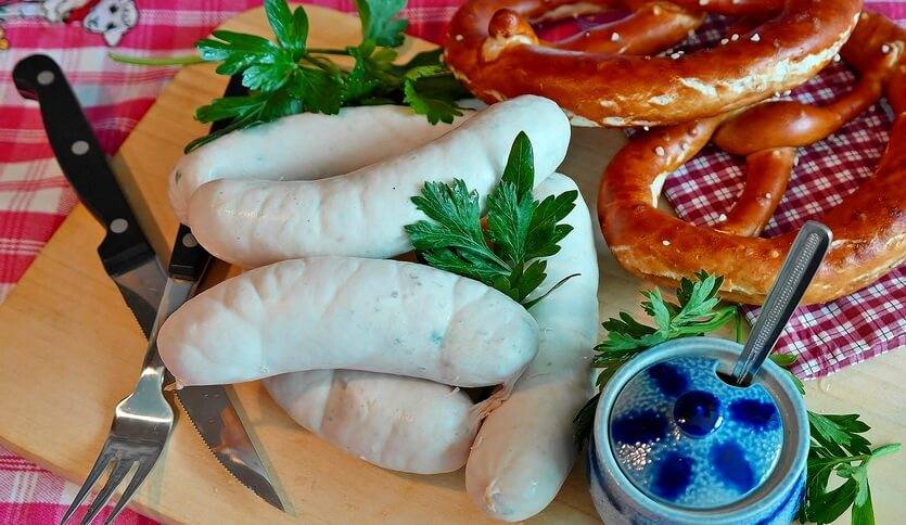 - Брецели с горчицей и колбасками вайсвурст.