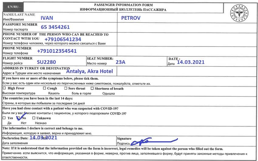 Исходя из официальных источников Посольства РФ в Анкаре, до отправки пассажиры должны заполнить обязательную анкету, в которой указываются личную информацию, данные для связи, адрес пребывания. Необходимым полем для заполнения также считают состояние здоровья туристов, а именно — симптомы, если они есть.