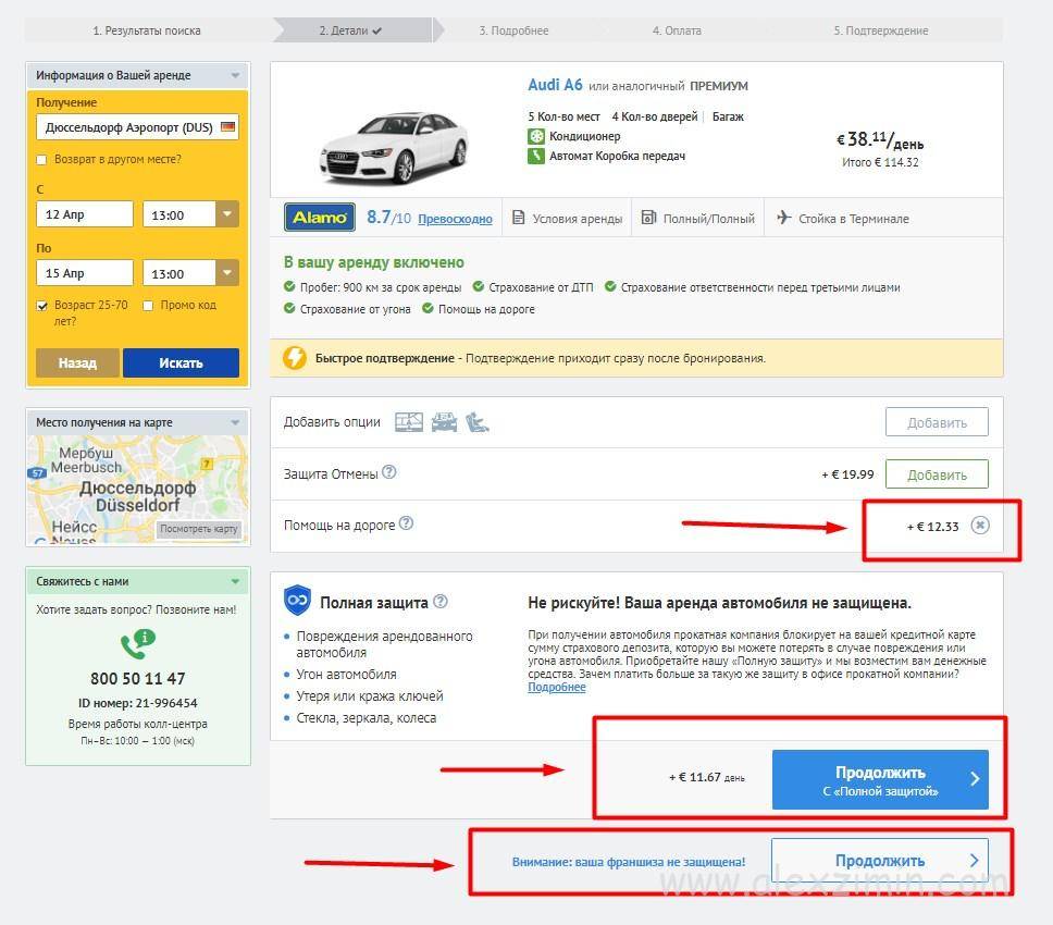 На этом этапе Вы можете включить дополнительную страховку, а также доп.оборудование (GPS, детское сидение, wi-fi роутер). На страховку соглашаемся, оборудование не нужно: