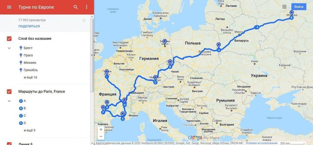 Маршрут включает в себя 10 пунктов назначения с учетом пункта отправления — Москвы. Далее на машине через Беларусь и Польшу, до Праги, затем в Мюнхен и во Францию (в города Гренобль, Марсель, Сетфон, Роан Сен Мари и обратно в Гренобль). Оттуда на поезде в Париж, а после Парижа в Берлин на самолете. Возвращение из Берлина в Москву так же на самолете. В данном случае четыре туриста разделились в Гренобле: двое поехали дальше на машине в Австрию, а двое сели на поезд в Париж. Этот маршрут считается длительным.