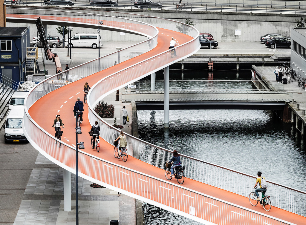 - Мосты Копенгагена. В столице Дании много велосипедов и много воды. Последняя является серьезным препятствием для передвижения, но это вовсе не означает, что стоит отказаться от любимого байка. Один из мостов представляет собой уникальное сооружение, предназначенное для езды на двухколесном транспорте.