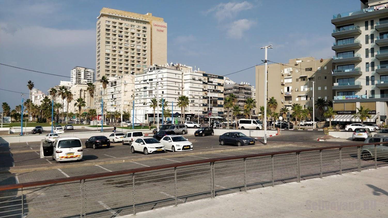 Типичная платная парковка с сине-белой разметкой бордюра на набережной Бат-Яма
